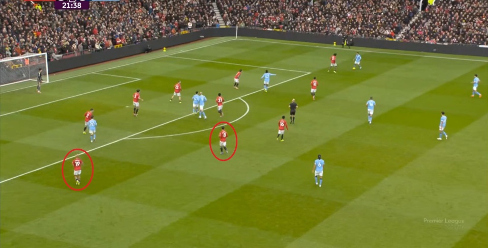 当然了,主场作战的曼联在开局阶段更需要展现强势,所以在向前的时候,利用人员层面自然可以拉开的宽度优势,曼联打得很坚决: